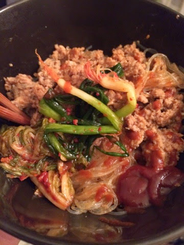 Add the pork mixture and sautée until nearly cooked through, stirring to break the grind into pieces. Add 1 cup of chicken stock and bring to a simmer. At this point I like to drain the glass noodles and lay them on top to steam finish.